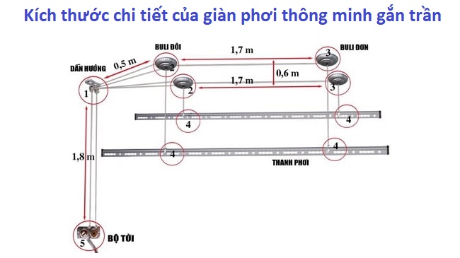 Về cơ bản, giàn gắn trần là hệ thống giá phơi quần áo sử dụng cơ chế nâng hạ thông minh thông qua bộ tời điều khiển. Cấu tạo của một bộ giàn phơi tiêu chuẩn bao gồm: