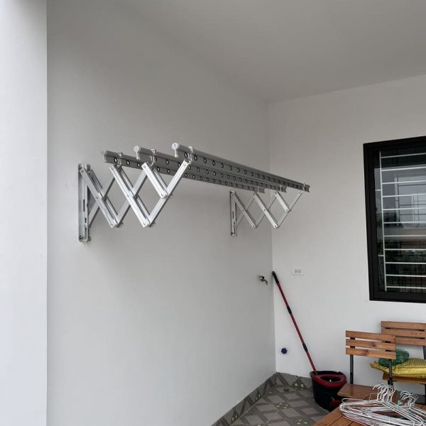 - Giàn phơi gắn tường xếp ngang: Giải pháp tối ưu cho những khu vực không có trần. Có thể kéo ra khi phơi và xếp gọn sát tường khi xong.